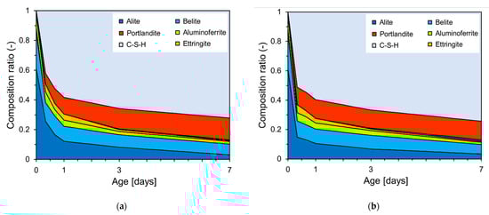 Figure 9 shows the Rietveld refinement analysis results based on the XRD patterns in Figure 8. Figure 9a,b show that the generation of portlandite and C-S-H hydration products increased with age. The composition ratio (y-axis) was calculated by weight fraction. The quantity of C-S-H generated at the early stages of hydration was found to be approximately 9% higher in PCSH3 compared to PCSH0.
