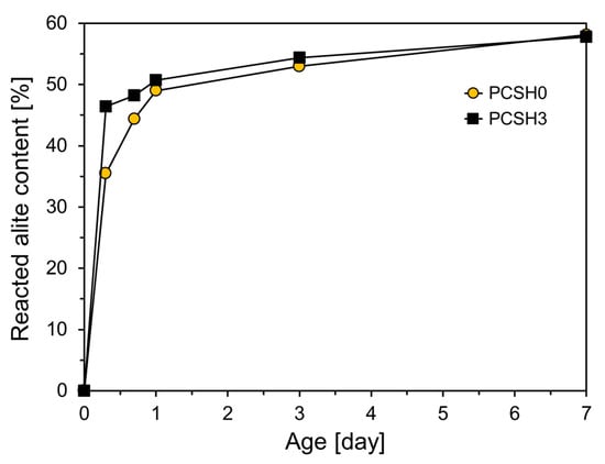 The generation of C-S-H and portlandite increased with increasing consumption of alite as shown in Figure 10. The PCSH0 and PCSH3 specimens showed the most noticeable differences in alite reduction at early ages, as depicted in Figure 10. The reacted alite contents of PCSH3 were 10.9, 3.8, 1.7, and 0.4% higher than those of PCSH0 at 8 h, 16 h, 1 d, and 3 d, respectively. This is related to the finding that the PCSH3 specimen had a higher early-age compressive strength than that of PCSH0 [].