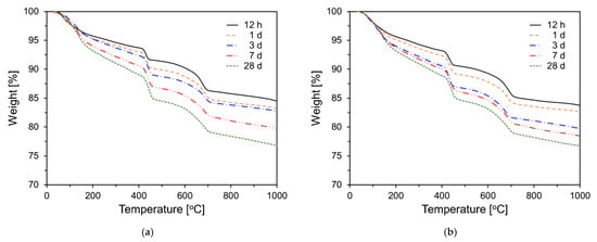 TG analysis was performed using an SDT Q600 (TA Instruments, New Castle, DE, USA) to investigate the paste’s hydration behavior at different ages. The weight change was measured while the temperature was increased to 1000 °C at a rate of 10 °C/min in a nitrogen atmosphere (100 mL/min). The samples were prepared using the same method as that used for preprocessing the paste specimens for XRD.