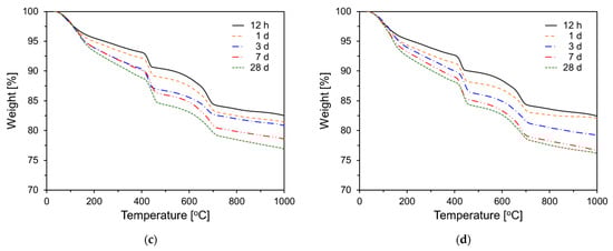 Figure 11 shows the TG results for PCSH series paste specimens tested at different ages. For all samples, the amount of hydration products tended to increase with increasing age. This is based on the weight changes in the 70–200 °C temperature range, which corresponds to C-S-H and ettringite [,]. In addition, this tendency is observed in the 400–500 °C temperature range, which corresponds to Ca(OH)2 [].