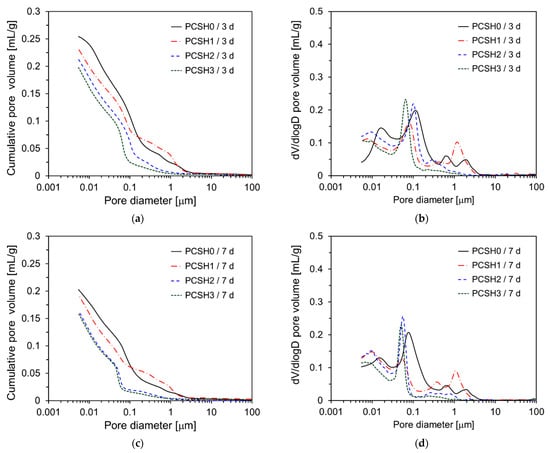 Figure 13 shows the pore structure of PCSH paste specimens determined by MIP. Figure 13a shows that the cumulative pore volumes of PCSH0, PCSH1, PCSH2, and PCSH3 at 3 d were 0.25, 0.23, 0.21, and 0.20 mL/g, respectively. The unit mL/g represents the volume of mercury intruded per gram of sample, indicating the total pore volume per unit mass of the specimen. The cumulative pore volume exhibits a decreasing trend as the content of C-S-H nanoparticles increases. This is because the microstructure was densified as the C-S-H nanoparticles that act as nucleation sites accelerated the generation of hydration products. A tendency similar to that of 3 d was observed at 7 d, however, the magnitude of the difference decreased. PCSH2 and PCSH3 show very similar values (Figure 13c). All samples exhibit similar values (0.16 to 0.18 mg/L) for the cumulative pore volume at 28 d, similar to the compressive strength tendency shown in Figure 6. The dV/dlogD graphs in Figure 13 show that the pore diameter decreases over time for all samples. Figure 13b shows that the main peak near 1 μm occurs at a smaller pore diameter with an increase in the content of the C-S-H nanoparticles at 3 d; this is attributed to a reduction in the pore size due to the accelerated production of hydration products in the presence of the C-S-H nanoparticles. However, at curing ages of 7 days and 28 days, this trend was not clearly evident. These findings are consistent with the compressive strength results.