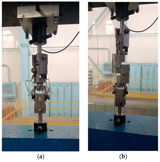 Tensile and shear testing of each set of glued sample assemblies were performed on a universal mechanical machine 2054 P-5 at the same load rate of 2 mm/min. To fix the glued sample assemblies with a coating in the tensile testing machine, a rig with a hinged joint was used (Figure 2).
