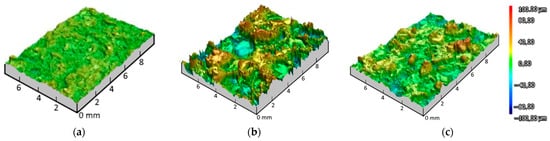 The results of 3D laser scanning of Ti6Al4V alloy substrate subjected to gas-abrasive treatment and Zr and HA coatings on Ti6Al4V alloy substrate are represented in Figure 3.