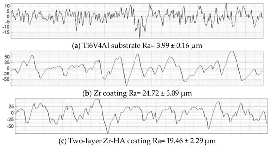 The results obtained in this study allowed us to estimate the average roughness (Ra) of the Ti6V4Al substrate, Zr coating and two-layer Zr–HA coating. For comparison, Figure 4 shows the results of measuring the surface roughness of the titanium alloy substrate subjected to gas-abrasive processing and two types of microplasma-sprayed coatings.