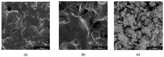 SEM images of the surface: Ti6V4Al substrate after gas-abrasive treatment (a); Zr coating (b); two-layer Zr–HA coating (c). Scale bars are 100 µm.