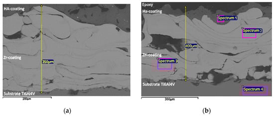 Furthermore, the cross-section of Zr–HA two-layer coatings were obtained using scanning electron microscopy (SEM) (Figure 6). The chemical composition of the two-layer coating was analyzed with EDX in certain spectra shown in Figure 5 and outlined in Table 4.