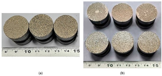 Before spraying, the end surface of the samples was degreased and gas-abrasive treated, the mode of which is presented in Table 3. Normal electrocorundum 25A F30 (500–800 μm) was used as an abrasive (ISO 6344-2:1998 []). After gas-abrasive treatment, the samples for coating application were subjected to ultrasonic surface cleaning in an isopropyl alcohol environment for 15 min. The coatings were applied to the surfaces of the samples no more than two hours after the above preparation. Plates measuring 10 × 15 mm with a thickness of 2.5 mm were used for metallographic and mechanical analyses, while discs with a diameter of 10 mm and thickness of 1 mm were used for biological assessments.
