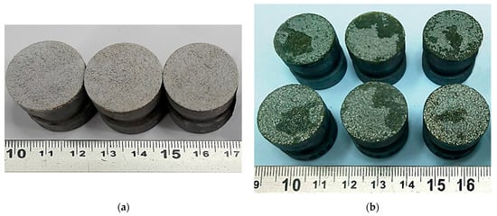 Appearance of samples sprayed with HA coating on a Zr sublayer for measuring shear adhesion strength: (a) before testing; (b) after testing.