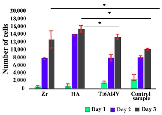 The results of the study showed that the proliferation rate for cells on the surface of Ti6Al4V alloy after gas-abrasive processing, which is widely used as a material for implants, was lower by 23% compared to the control group. Zirconium coating had a minor effect on osteogenesis, increasing osteogenic differentiation by 5% compared to the Ti6Al4V alloy. The study of the proliferation rate for cells on HA coatings showed a statistically significant increase of approximately 45% compared to the control group.