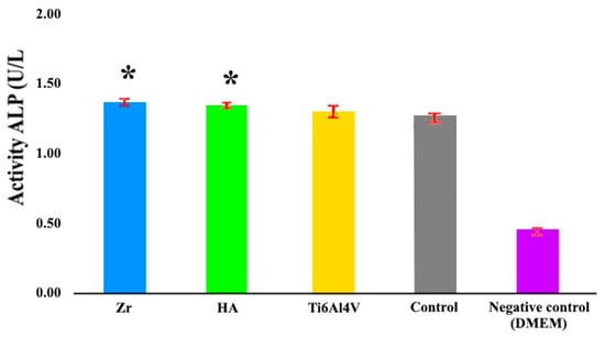 Early osteogenic activity studies using alkaline phosphatase ELISA, performed after two weeks of differentiation, showed a statistically significant increase in alkaline phosphatase activity of 9% and 6% for the Zr and HA coating, respectively, compared to the Ti6Al4V alloy control group (Figure 11).