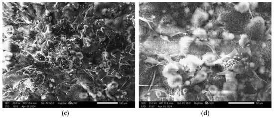 The process by which cells adhere to bone graft materials remains an area of active research. Scanning electron microscopy (SEM) is widely regarded as the most effective technique for observing cell behavior on material surfaces. Prior studies [,,] have shown how bone-like cells interact with titanium surfaces during attachment. These cells are capable of sensing and responding to the three-dimensional features of the substrate due to their adaptable cytoskeletal structure. As such, variations in surface roughness can influence the strength of cell adhesion, which in turn affects key cellular functions including proliferation, migration, and differentiation []. The images presented in Figure 13 illustrate surface roughness as a key feature of the implant coatings, characterized by varying pore sizes and distinct topographic patterns. The rough surface morphology observed in the SEM images appears to play a significant role in facilitating cell attachment and proliferation. Consistent with previous studies that emphasize the role of surface roughness in modulating cellular behavior, our findings further underscore its importance in enhancing biological responses at the implant interface and promoting successful osseointegration [,].