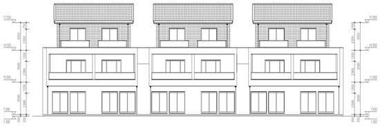 This study focuses on a light-gauge steel frame residential project located in Shangxing, Liyang. The building comprises three layers above ground and one at the basement level, with a typical story height of 3.5 m. Transversely, the building features three spans, totaling 42.35 m. Architectural drawings of the structural model are presented in Figure 1. Service loads, construction loads, and load combination factors for the model were determined by the Load Code for the Design of Building Structures [36] and the Code for Construction of Steel Structures [12]. Load case combination factors are detailed in Table 1, while the design load values for the model during its construction and service stages are presented in Table 2.