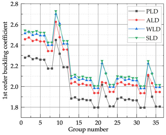 The first-order buckling coefficients for the construction phase under PLD, VLD, WLD, and SLD.