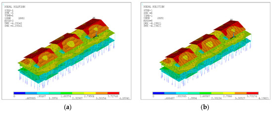 Through finite element analysis, the ultimate displacements at eight control nodes for the model under global defect dominance, based on the CRITIC method, were obtained, as illustrated in Figure 13. Nodes 1–4 correspond to the points of maximum displacement on the first floor, second floor, third-floor beam level, and roof level, respectively; Nodes 5–8 correspond to the points of maximum displacement at the mid-height of the first-story columns, second-story columns, third-story columns, and roof-level columns, respectively.
