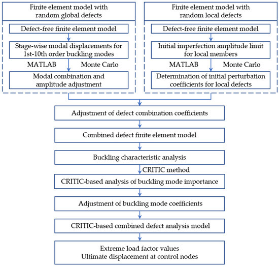The overall workflow of the proposed CRITIC-based combined defect model method is illustrated in Figure 7. Initially, random combined global and local defects are introduced into the established defect-free model using the Monte Carlo method. Subsequently, finite element analysis is performed on this combined defect model to obtain data, including the critical load factor values for the uncorrected model. Subsequently, utilizing the obtained data, the CRITIC method is employed to redefine the weight coefficients for the first 10 buckling modes. This enables a refined assessment of the influence of these buckling mode weights on model stability under combined defect conditions, thereby facilitating the identification of the most unfavorable operational scenarios. Furthermore, these redefined coefficients, , replace the buckling mode combination coefficients originally generated by the Monte Carlo method, effectively substituting Equation (1) with Equation (16). Finally, once the new modal combination form is established, its amplitude is adjusted. The ANSYS finite element analysis software is then employed for the solution, yielding the final buckling characteristics of the LGSF material model.