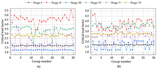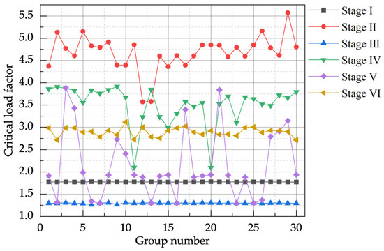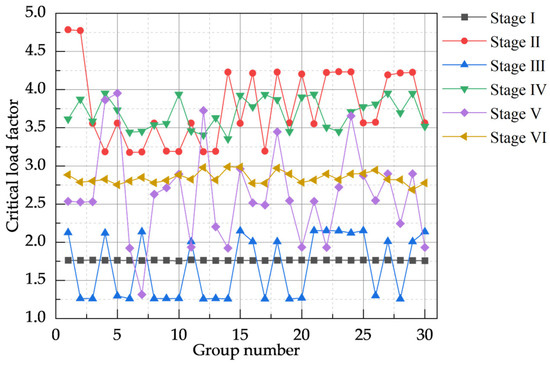 The calculated critical load factor results for the D20_L are presented in Figure 10. The results show that construction stage III had the lowest mean critical load factor (1.680294), while stage II exhibited the highest (3.76211). Sensitivity analysis of the model to combined defects dominated by local defects indicated that stages I and VI were relatively insensitive to such defect variations, with SD of 0.0028 and 0.0740, respectively; their critical load factors were also comparatively small. In contrast, the critical load factors for stages II, III, and V were more significantly affected by these defect variations, with SD values of 0.4910, 0.4180, and 0.6240, respectively.