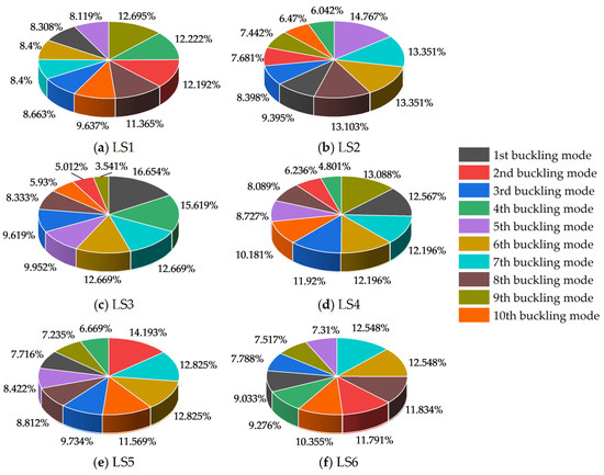 Under GS1, the 4th-order buckling mode had the highest weight (15.42%), while the 6th-and 7th-order modes had the lowest (both 1.85%). Modes with weights exceeding 10% included the 2nd, 4th, 8th, 9th, and 10th. For GS2, the 8th-order buckling mode was dominant (33.69%), and the 3rd-order mode had the minimum weight (1.19%). Modes exceeding 10% weight included the 1st, 8th, 9th, and 10th. In GS3, the 3rd-order buckling mode carried the largest weight (15.80%), with the 10th-order mode being the smallest (5.15%). Modes with weights over 10% were the 3rd, 5th, 6th, 7th, and 9th. For GS4, the 9th-order buckling mode ranked first in weight (20.98%), while the 3rd-order mode was lowest (7.09%). Modes exceeding 10% included the 9th and 10th. In GS5, the 8th-order buckling mode had the maximum weight (17.36%), and the 9th-order mode had the minimum (6.19%). Modes with weights over 10% included the 2nd, 8th, and 10th. For GS6, the 1st-order buckling mode was most significant (23.30%), with the 3rd-order mode having the smallest weight (4.54%). Modes exceeding 10% weight were the 1st, 2nd, 5th, and 8th.