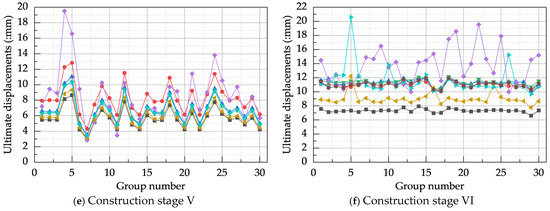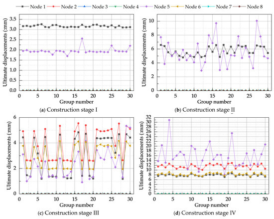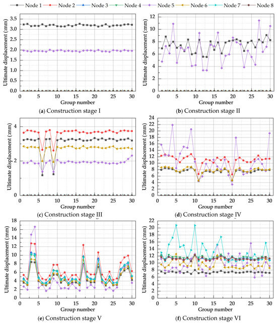 Through finite element analysis, the ultimate displacements at eight control nodes for the model under local defect dominance, based on the CRITIC method, were obtained, as illustrated in Figure 14. Similar to the displacement variations observed under global defect dominance, nodal displacements in stage I were relatively uniform without excessive fluctuations. In stage II, due to the increased scale of the columns, significant variations in displacement occurred across different defect group numbers. Stages IV-VI all exhibited variation characteristics similar to those observed under global defect dominance. Differing from the global defect-dominated scenario, however, system displacements under local defect dominance in stage III showed substantial fluctuations, indicating that the overall structure is more sensitive to local defects during this particular stage.