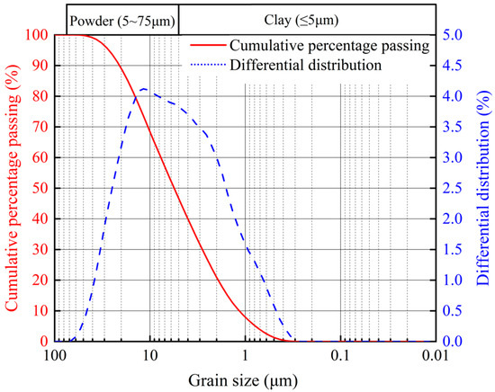 The dredged sediment used in this study (Figure 1) was collected from a project in Zhejiang Province, China. The material is gray, exhibits low strength and high compressibility, and contains organic matter. Its fundamental physical indices are summarized in Table 1. The natural water content of the sediment exceeds its liquid limit, and the natural porosity ratio is greater than 1.5. According to the soil classification criteria outlined in the Chinese standards [29], the soil sample is classified as sludge. The particle size distribution of the dredged soil was measured using the Biotek-2600 laser particle size analyzer. Figure 1 reveals that the clay particle content (≤5 μm) is 46.69%, while the powder particle content (5~75 μm) is 53.31%.