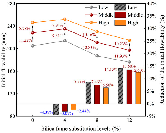 Figure 4 illustrates the variation in the initial flowability of FSS with different levels of SF substitution. The results show that the initial flowability reaches its maximum at a 4% SF substitution, corresponding to the optimal working performance. However, as the SF substitution increases beyond 4%, the initial flowability demonstrates a gradually decreasing trend. Specifically, the increased initial flowability observed for SF4 (4% SF substitution) compared with SF0 (the control group) was within 5%. In contrast, the reduced initial flowability for SF8 (8% SF substitution) and SF12 (12% SF substitution) fell within ranges of 5–10% and 10–15%, respectively. These findings suggest that incorporating moderate amounts of SF enhances the workability of FSS, whereas excessive SF content diminishes the workability of soil. The improved flowability at low SF substitution levels can be attributed to the “ball effect” of SF’s spherical and smooth particles, reducing friction and enhancing lubricity [36]. Moreover, the high specific surface area of SF promotes particle dispersion and water adsorption, leading to the formation of a hydration film that further improves flowability [37]. Furthermore, the fine particle size helps fill pores and reduce porosity, thereby enhancing rheology properties [38]. However, SF contents above 8% substantially increase surface area and water demand, reducing available free water and increasing viscosity. Higher SF contents also enhance particle friction and raise yield stress, further diminishing flowability [39].