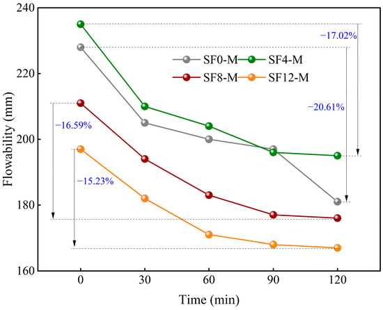 Figure 5 and Figure 6 demonstrate the effects of SF substitution and variations in the WSR on the time-dependent flowability of FSS. The results indicate that the flowability of FSS decreases markedly over time. Specifically, the flowability of FSS without SF replacement (SF0-M) exhibits decreases of 23, 28, 31, and 47 mm after 30, 60, 90, and 120 min, respectively. The flowability of FSS with SF substitution levels of 8% (SF8-M) exhibits decreases of 17, 28, 34, and 35 mm, respectively. This finding suggests that SF replacement substantially influences the characteristics of the time-dependent flowability of FSS. In the group without SF replacement (SF0), the flowability of the FSS decreased rapidly from 0 to 30 min, and the loss rate of the flowability was close to 10%. The decrease from 30 to 90 min slowed down, and the loss rate of the flowability was about 12% and 14% in 60 and 90 min, respectively. However, the decrease in the section from 90 to 120 min had a second surge, and the loss rate of the flowability exceeded 20%. By contrast, the group utilizing SF replacement cement (SF4, SF8, and SF12) exhibited a comparable trend to the group not employing such cement during the 0~90 min interval. However, during the 90~120 min period, the decline rate did not demonstrate a surge; instead, it exhibited a more gradual decline. Furthermore, comparing 2 h flowability loss rates, SF0 exhibited higher losses than SF4, SF8, and SF12, and these losses decreased as SF content increased. This finding suggests that incorporating SF enhances the flowability retention capacity of FSS during the early construction stage (within 2 h), corresponding to the extension of the construction window. This phenomenon can be attributed to the optimization of particle grading using SF, which effectively reduces the specific surface area of cementitious materials and inhibits the early-age hydration activity of C3S/C2S by filling the gaps in the mixed particles and enhancing the stacking compactness. As the SF substitution increases, the particle-stacking compactness also increases, and the hydration reaction slows down more pronouncedly [41].
