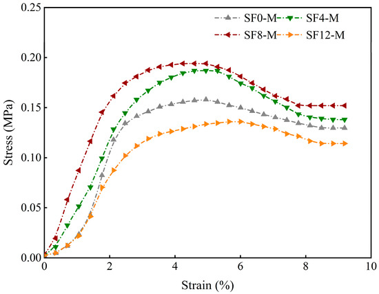 Stress–strain curves of different SF substitution rates at 3 days of curing.