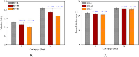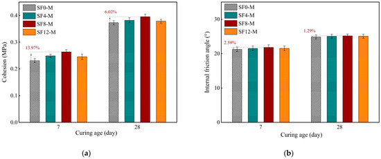 Direct shear parameters of FSS with different SF substitution at 3, 7, and 28 days of curing: (a) cohesion; (b) internal friction angle.