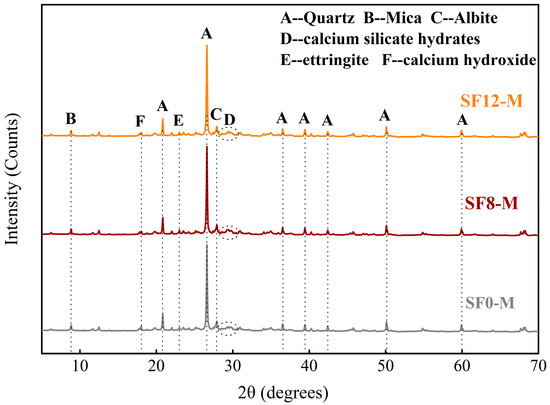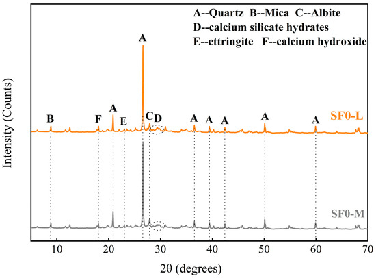 XRD analysis was conducted to elucidate the effects of SF substitution and WSR on hydration product formation and phase assemblages in FSS. Figure 13 and Figure 14 display diffraction patterns for SF-free samples (SF0-L and SF0-M) and SF-substituted samples (SF8-M and SF12-M) after 3 days of curing. While all groups share similar primary crystalline phases (quartz, mica, albite, calcium silicate hydrates (C-S-H), ettringite (AFt), and calcium hydroxide (Ca(OH)2)), significant quantitative differences emerge in key hydration products, mainly judged by the relative intensities of the key diffraction peak. Observing the broad hump at 2θ ≈ 29°, we can see that the diffraction peak intensities of the three groups are SF8-M > SF12-M > SF0-M, confirming that the pozzolanic effect of silica fume and calcium hydroxide generates additional C-S-H gel in the early curing stage. SF12-M exhibits weaker hump intensity than that of SF8-M owing to the presence of unreacted SF and less cement content in SF12-M. SF0-M displays markedly higher calcium hydroxide peak intensity than SF8-M and SF12-M, validating the Ca(OH)2 consumption caused by SF’s pozzolanic reaction during early hydration. Additionally, SF8-M exhibits stronger ettringite peaks than SF0-M; it may be that moderate alkalinity enhances AFt formation by promoting aluminum dissolution, whereas excessive Ca(OH)2 in SF0-M inhibits it. Finally, variations in the WSR mainly affect absolute peak intensities, in line with their observed impact on early-age mechanical performance.