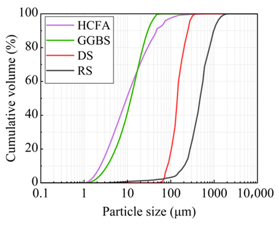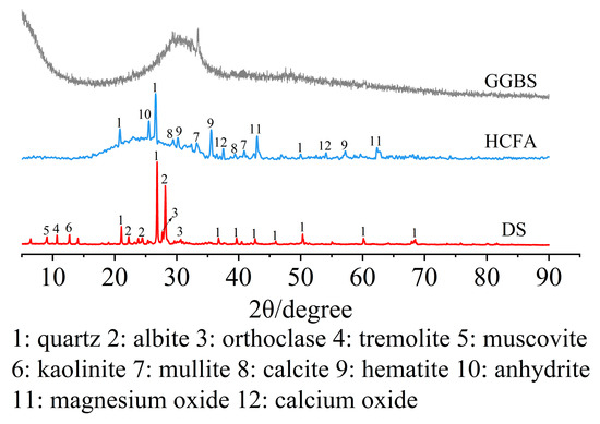 The raw materials came from Xinjiang, China. The alkali activation precursor materials are HCFA (C grade) and GGBS (S95 grade). The aggregates are desert sand (DS) and river sand (RS). Table 1 shows the physical properties of the two types of sand. The chemical composition of the raw materials is shown in Table 2. Figure 1 shows an SEM image of a solid material. FA is spherical particles of different sizes, and GGBS is mostly irregular lumps. DS has a looser surface with rounded textured edges, while RS has a flat surface with angular textured edges. The river sand was passed through a 1.18 mm square hole sieve to reduce aggregate particle size differences. The particle size distribution of the material showed that the median particle size of DS (50% cumulative volume) was 143.18 μm, containing many very fine particles (VFPs < 175 μm), as shown in Figure 2. DS has a high CaO content. Figure 3 shows the XRD results for DS, HCFA, and GGBS.