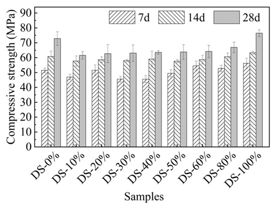 Figure 7 shows the relationship between compressive strength and DSRR. When the content was 10%, the compressive strength was 61.52 MPa, which is 15.54% lower than that when the content was 0%. When the DSRR was 10~80%, the intensity grew slowly. When the DSRR was increased to 100%, the compressive strength reached its maximum value (76.45 MPa). Compared to the samples with DSRRs of 0% and 80%, they improved by 4.96% and 14.28%, respectively. At 7 d, the compressive strength of some samples with a high DSRR was lower than that of samples with a low DSRR. With the increase in age, the 14-day compressive strength of high-content and low-content mortar was similar, and the 28-day compressive strength was also similar. These results suggest that DSRR may affect the early alkali activation response rate of alkali-activated mortars. Table 5 shows the differences in the compressive strength of alkali-activated materials in this paper and other studies.
