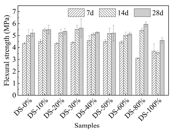 Figure 8 shows the relationship between flexural strength and DSRR. When the DSRR changes in the range of 0%~60%, there is no significant difference in flexural strength (p-value is 0.132). When the DSRR is 80%, the flexural strength reaches the maximum value (5.95 MPa), which is 14.24% higher than that when the DSRR is 0%. When the DSRR continues to increase to 100%, the minimum flexural strength (4.60 MPa) occurs, which is 11.76% lower than that when the DSRR is 0%.