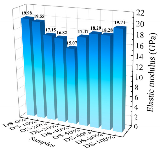 Figure 11 shows the relationship between the modulus of elasticity and the DSRR. When the DSRR is 0%~40%, the elastic modulus of the mortar decreases from 19.98 GPa to 15.07 GPa. After this, the modulus of elasticity increases. When the DSRR is 100%, its modulus of elasticity is 19.71 GPa. The elastic modulus of the mortar decreases first and then increases, similar to the change in compressive strength [78]. Combined with the mechanical property test, the improvement in DSRR has positive and negative effects on the mechanical properties of the mortar, which in turn affects the elastic modulus of the mortar. In addition, a larger DSRR also increases the number of VFPs, improving the overall performance of the mortar and, thus, the sample performance.