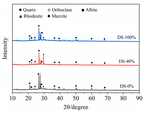 The XRD test results of the mortar at 28 days of age are shown in Figure 12. Sharp peaks appear in the range of 2θ in the range of 20°~40°, indicating that the crystallinity of the hydration products was good. The results showed that the hydration products of the samples were basically the same under different DSRR conditions, mainly composed of quartz, orthoclase, albite, rhododite, rhododochrolite and needle zeolite, but their contents changed greatly. The diffraction peak of quartz decreases with the increase in DSRR. On the one hand, this is the reaction of the active SiO2 in an alkaline environment. On the other hand, desert sand can promote the dissolution of HCFA and affect the alkali activation reaction. In addition, desert sand contains a large amount of SiO2 (see Table 2). The decrease in the intensity of the diffraction peak can also indicate that desert sand dissolves under alkali activation and participates in part of the alkali activation reaction. Therefore, the strength of the sample will still develop at a later stage, and the mortar has a high mechanical strength. As can be seen in Figure 12, there is a significant spike when the DSRR is 40%; it is the diffraction peak of the rhodochrosite phase, located at 2θ = 29.5°. When the DSRR is 100%, the intensity of the diffraction peak of the product decreases. According to the analysis in Table 2, it can be seen that desert sand contains a large amount of CaO. Ca2+ has been described as a substitute for Na+ in gels [79]. Due to the increase in DSRR, more desert sand is involved in the reaction. Ca2+ facilitates the conversion of amorphous N-A-S-H gels to C-A-S-H gels with crystallinity [80]. There are more and more C-A-S-H gels in the matrix, and the structure is becoming denser and denser. In addition, DS and FA have similar chemical compositions (see Table 2), which reinforces the idea that desert sand will be involved in partial alkali activation reactions. The diffraction peaks of orthoclase and albite at 2θ = 27.5° and 28° change from weak to strong with the increase in DSRR. Orthoclase and albite are mineral phases in desert sands (see Figure 3). On the one hand, the dissolution of VFPs in an alkaline environment is limited. On the other hand, the compressive strength exhibits a slow rise due to the increase in C-A-S-H gel, which hinders the dissolution of silicon–aluminum substances.
