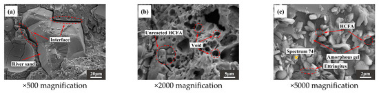 Figure 13a,d,g are photomicrographs of aggregate and slurry bonding. It can be seen that there is a clear dividing line where the slurry meets the RS, with a wide crack between the two. However, the slurry is more tightly bound to the DS. In addition, when the DSRR is 100%, it can be observed that there is gel attached to the surface of the desert sand in Figure 13g. The interface between the matrix and the aggregate is enhanced, and the mechanical strength is improved. When the DSRR is 0% and 40%, there are undissolved fly ash particles, as shown in Figure 13b,e. When the DSRR reaches 100%, it is difficult to see the exposed fly ash particles, suggesting that the DSRR affects the degree of reaction of alkali activation. Interestingly, Figure 13h shows some gel-filled voids, thereby refining the pore structure within the matrix. Figure 13c,f,i show varying degrees of morphology of hydrate products in the sample matrix for different DSRRs. When the DSRR is 0%, there are granular hydration products in the fly ash that are encased in the fly ash and form aluminite around it, and when the DSRR increases to 40%, the amount of aluminite in the matrix increases. When the DSRR reaches 100%, the aluminite in the hydration product is significantly reduced and is replaced by dense gel hydration products and needle-like crystals, and the specimen has a higher strength.
