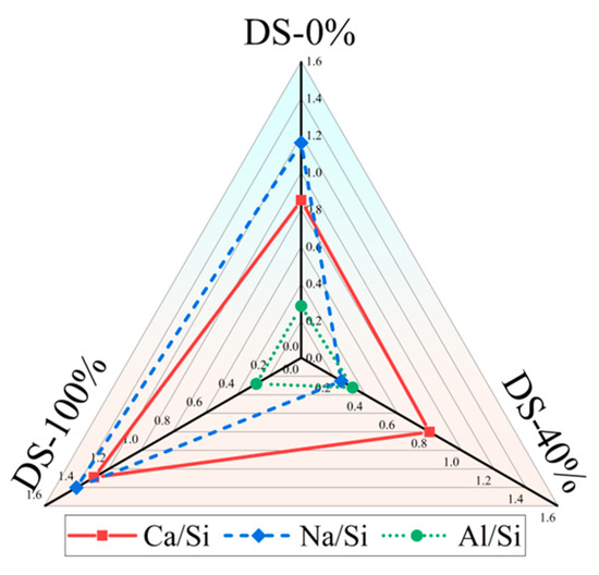 There is a significant positive correlation between Ca/Si and compressive strength [81,82]. Table 6 shows the EDS test results for the samples. Figure 14 shows that Ca/Si tends to decrease and then increase as DSRR increases. The compressive strength of the specimen also shows the same trend, which provides strong support for the macroscopic mechanical strength analysis. When the DSRR is 100%, the sample has a high Ca/Si, which may explain why the mortar can exhibit high strength when the DSRR is 100%.