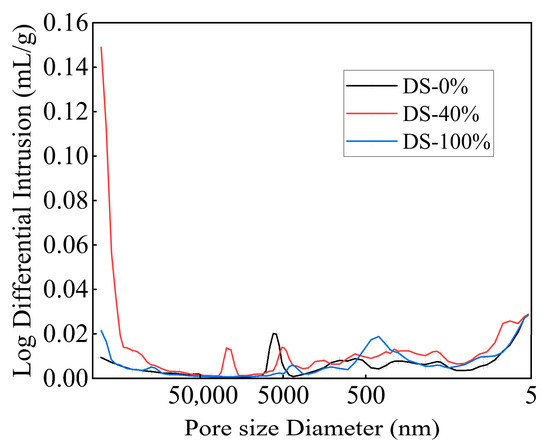 The pore size distribution curves of the mortar under different DSRRs are shown in Figure 15. While the pore size distribution curves of the samples have the same trend, the peak positions, peak intensities, and peak widths differ, meaning that the samples under different DSRRs had similar well types and different well sizes. When the DSRR is 0% and 100%, the distribution curve is flat, indicating that the pore size distribution is more reasonable. When the DSRR is 40%, the pore size distribution curve fluctuates obviously, the peak position shifts to the left, the pore size distribution is unreasonable, and there are many large-pore-size pores. Due to the low hydration of the sample, the gel generated in the matrix cannot fill the large pores.