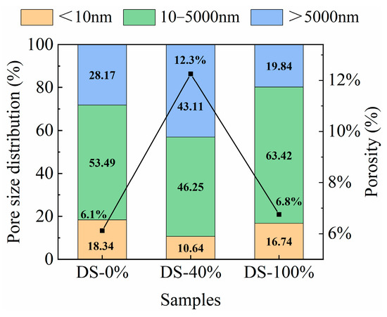 The porosity and pore type percentages under different DSRRs are shown in Figure 16. At the DSRR levels of 0%, 40% and 100%, the porosity of the sample was 6.1%, 12.3% and 6.8%, respectively, showing a trend of first increasing and then decreasing. The results showed that at 0% and 100% DSRR, the density of the matrix was better than at 40% DSRR. This explains the fact that the sample shows poor compressive strength when the DSRR is 40%, but the sample shows higher compressive strength when the DSRR is 0% and 100%. The study classified the pores into three types: gel micropores (<10 nm), capillary pores (10–5000 nm), and macropores (>5000 nm) [83]. In alkali-activated materials, a 10 nm pore is considered to be the dominant pore structure [84]. According to the calculation in Figure 16, when the DSRR is 0%, 40% and 100%, the ratios of capillary pores to gel pores in the sample matrix are 2.94, 4.35 and 3.78, respectively, so the influence of capillary pores on the drying and shrinkage performance of the sample is dominant. When the DSRR is 40%, there are fewer micropores in the specimen matrix, which also indicates that the specimen matrix is less dense and has higher strength. It was also found that there were more capillaries in the sample, which affected the drying and shrinkage properties of the sample. The data shows that the sample has the highest percentage of capillary pores when the DSRR is 100%. During the formation and development of the pore structure, these capillaries are further transformed into capillary pores, resulting in greater shrinkage stresses than when the DSRR is 0% and 40%, resulting in greater drying shrinkage of the mortar. However, an interesting phenomenon is that when the DSRR is 100%, the sample has a high compressive strength. Combined XRD and SEM analysis showed that desert sand participated in the alkali activation reaction and promoted the formation of gel under alkali activation conditions. The increase in gel micropores leads to a denser matrix, which contributes to the development of strength. The results show that the preparation of alkali-activated mortar by replacing RS with DS has positive and negative effects on the hydration, drying shrinkage and pore development of cement. The results show that when the DSRR is 100%, the specimen shows excellent strength and good pore development, which proves its feasibility.
