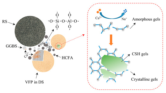 - Garcia-Lodeiro, I.; Palomo, A.; Fernández-Jiménez, A.; Macphee, D. Compatibility studies between N-A-S-H and C-A-S-H gels. Study in the ternary diagram Na2O–CaO–Al2O3–SiO2–H2O. Cem. Concr. Res. 2011, 41, 923–931. [Google Scholar] [CrossRef]