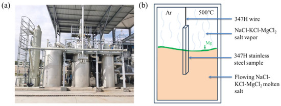 Next-generation concentrated solar power (CSP) technology has gained increasing attention for its high operating temperatures, improved power generation efficiency, and enhanced economic benefits [1,2,3,4]. Among potential thermal storage and heat transfer media, molten chloride salts (e.g., NaCl-KCl-MgCl2) are highly promising due to their excellent thermophysical properties, including low viscosity, high specific heat capacity, high thermal stability (>800 °C), and low cost (<0.35 USD∙kg−1) [5,6,7,8,9]. However, unlike commercially used molten nitrates, molten chlorides are more corrosive to metallic structural materials at elevated temperatures [10,11,12]. This poses a significant challenge for the selection of materials for CSP systems. The choice of materials is critical to ensure the reliability and efficiency of the system over the long term [13].