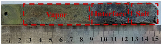 The corrosion test was continued for 100 h at 500 °C. After exposure, the sample was cooled and ultrasonically cleaned sequentially with tap water, deionized water, and anhydrous ethanol, and then dried with cool air. After cleaning, thickness measurements were taken at five positions within each region, with three repeated readings per position to ensure data accuracy. Corrosion behavior was evaluated separately for the vapor, interface, and molten salt regions.