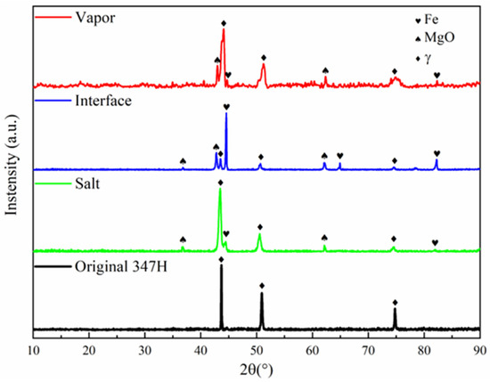 XRD analysis revealed distinct phase transformations in the three regions (Figure 3). The austenitic structure of SS347H remained predominantly stable across all regions, with additional diffraction peaks corresponding to Fe and MgO. Notably, the interface region exhibited strong Fe peaks surpassing those of the matrix, along with pronounced MgO peaks, indicating more complicated corrosion at this interface. The appearance of strong iron peaks will be discussed in Section 4.