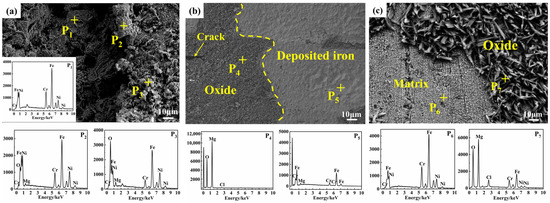In the interface region, the surface was relatively flat and exhibited two distinct areas. On the left side of Figure 4b, a dense, dark gray oxide layer showed high O and Mg content (P4), indicating MgO formation. On the right side, a smooth, light gray area was primarily composed of Fe and Cr.
