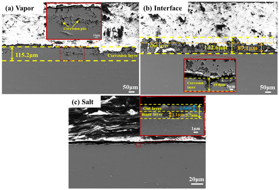 Cross-sectional morphology of SS347H after 100 h of NaCl-KCl-MgCl2 molten salt corrosion: (a) vapor region, (b) interface region, and (c) molten salt region.