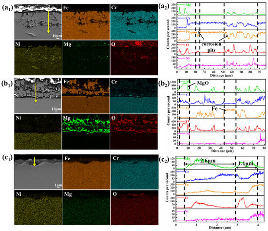 EDS elemental mappings (Figure 6) highlighted compositional changes. In the vapor region, corrosion primarily involved the dissolution of Cr and Fe, leading to their depletion, while Ni became enriched in the corrosion pits. The line scan results (Figure 6(a2)) confirm that Fe and Cr decreased in the pits, while Mg, O, and Ni concentrations increased. Mg and O infiltrated the corrosion region, forming MgO, with some oxide adhering to the surface. In the interface region, significant Fe deposition and MgO formation were observed (Figure 6(b1,b2)), along with some Cr enrichment, distinguishing it from the corrosion observed in the vapor region. The corrosion inhibitor Mg effectively reduced corrosion in the interface and salt regions but had a limited effect on vapor-phase corrosion. In the molten salt region, minimal corrosion was observed, with only a small amount of corrosion products in the outer layer and depletion of Cr and Fe in the inner layer. The outer corrosion layer had increased concentrations of Mg, O, and Cr, indicating the presence of MgCr2O4. The inner layer contained MgO, confirming the reaction of Mg and O in this region.