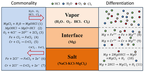 These corrosion processes are summarized schematically in Figure 7. All three regions shared common corrosion pathways involving chemical reactions with H2O and O2, producing corrosive substances such as Cl2 and HCl, and causing dissolution of Fe and Cr into ionic forms. Variations in corrosion severity were due to differing concentrations of Cl−, H2O, and O2−. The highest concentrations in the vapor region resulted in the most severe corrosion, while the lowest concentrations in the molten salt region resulted in minimal corrosion. Magnesium-driven displacement reactions at the interface further altered the corrosion dynamics.