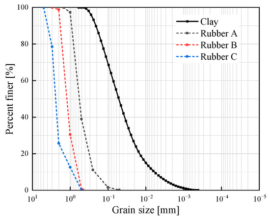 In this study, the rubber particles originated from Huayi Rubber Co., Ltd. (Chengdu, China) and were prepared by crushing waste tires, and their size distribution is shown in Figure 1. Three distinct gradations of waste rubber particles, generated from crushed waste tires, were investigated. As depicted in Figure 3, the particle sizes of Rubber A (d50 = 0.59 mm), Rubber B (d50 = 1.28 mm), and Rubber C (d50 = 2.46 mm) are close to the particle sizes of fine sand (0.075–0.425 mm), medium sand (0.425–2 mm), and coarse sand (2–4.75 mm), respectively. The coefficient of inhomogeneity (Cu) and the coefficient of curvature (Cc) for Rubber A were determined to be Cu = 2.95 and Cc = 1.12. In contrast, for Rubber B and Rubber C, the coefficients were Cu = 2.20 and Cu = 2.94, respectively, with Cc values of 1.05 and 1.81, respectively. Based on the United Soil Classification System (USCS) standards, the gradations of the three rubber materials under investigation can all be categorized as being equivalent to poorly graded sand (SP). In addition, the specific gravities of rubber A, rubber B, and rubber C were 1.09, 1.11, and 1.13, respectively. The rubber particles used in this study were irregularly shaped.