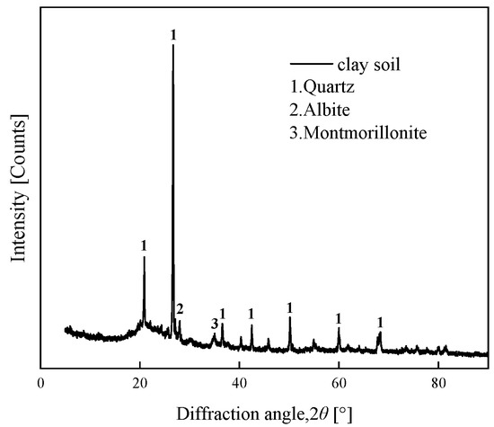 The soil sample, classified as Quaternary alluvial clay from the Middle Pleistocene epoch (Q2), was collected from a depth of approximately 10 m at an excavation site in Hankou District, Wuhan City, Hubei Province (30°35′ N, 114°17′ E). This region lies within the Jianghan Plain, a major Quaternary depositional basin of the Yangtze River system. The clay exhibited a characteristic yellowish-brown coloration, consistent with the iron oxide-rich, fluvio-lacustrine sediments typical of this geological formation. The soil exhibited a yellowish-brown coloration. After undergoing a drying process, the fundamental physical properties of the soil were assessed and are summarized in Table 1. The particle size distribution curve of the soil employed for testing is illustrated in Figure 1. X-ray fluorescence spectrometry (XRF) was utilized to ascertain the soil composition, and the obtained results are shown in Table 2. The X-ray fluorescence spectrometer is purchased from Riken of Japan (Rigaku, Akishima, Japan). The instrument model is ZSX Primus III+ 50KV 60mA. More than 50 percent of the soil was composed of SiO2, followed by Al2O3, which accounted for 18.75 percent of the mass. The XRD analyses indicated that the soil was predominantly composed of quartz, sodium feldspar, and montmorillonite clay minerals, and the results are presented in Figure 2.
