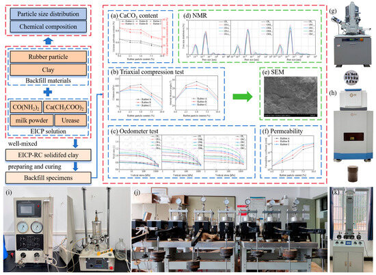 Using the enzyme-induced carbonate precipitation (EICP) technique to solidify rubber and clay mixtures as lightweight backfill is a feasible way to reduce waste tire impacts and boost rubber recycling in geotech engineering. In this study, a comprehensive laboratory investigation, including triaxial compression, oedometer, permeability, and nuclear magnetic resonance (NMR) tests, was conducted on EICP-reinforced rubber particle solidified clay (hereafter referred to as EICP-RC solidified clay) to evaluate the effects of rubber particle content and size on the mechanical behavior of the improved soil under various solidification conditions and to elucidate the solidification mechanism. The results show that although rubber particles inhibit EICP, they significantly enhance the mechanical properties of the samples. The addition of 5% rubber particles (rubber A) increased cohesion by 11% and the internal friction angle by 18% compared to EICP-treated clay without rubber. Additionally, incorporating smaller-sized tire particles facilitated pore filling, resulting in lower compression and swelling indices and reduced permeability coefficients, making these materials suitable for use behind retaining walls and in embankment construction.