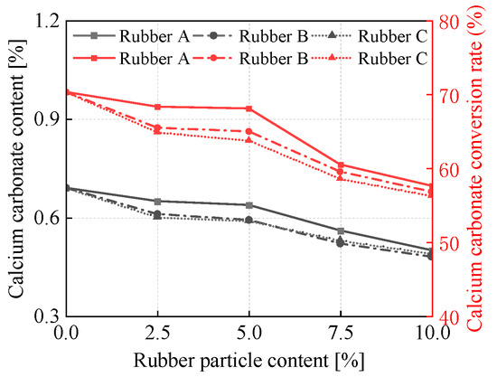 Variations of CaCO3 content and conversion rate for the testing samples with different rubber particle sizes and contents.