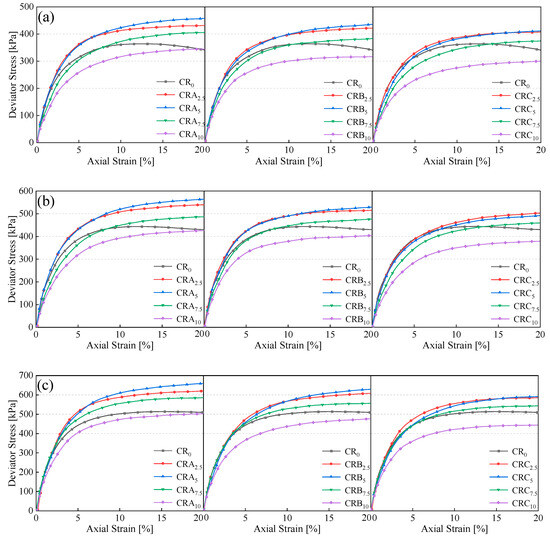 Stress–strain curves of EICP-RC solidified clay under different confining pressure: (a) 50 kPa, (b) 100 kPa, (c) 150 kPa.